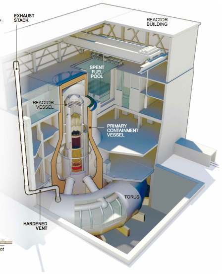 In de figuur is de kernreactor (rood) te zien, die zich binnen een containment bevindt, dat de vorm heeft van een omgekeerde gloeilamp, drywell genoemd. Dit containment is vervaardigd van beton van enkele meters dik. Hoopt zich stoom hierin op dan kan de druk zo hoog worden dat de stoom via dikke leidingen weggeleid wordt naar een torusvormig vat (wetwell) dat tot ongeveer de helft gevuld is met water. De stoom condenseert daar zodat de druk in het containment binnen de perken gehouden wordt. Heeft zich waterstof gevormd zoals hierboven omschreven, dan wordt dit ook meegevoerd doch condenseert niet en komt in het reactorgebouw terecht, waar het zich mengt met daar aanwezig zuurstof en ontploft door een altijd voorkomende vonkontlading.